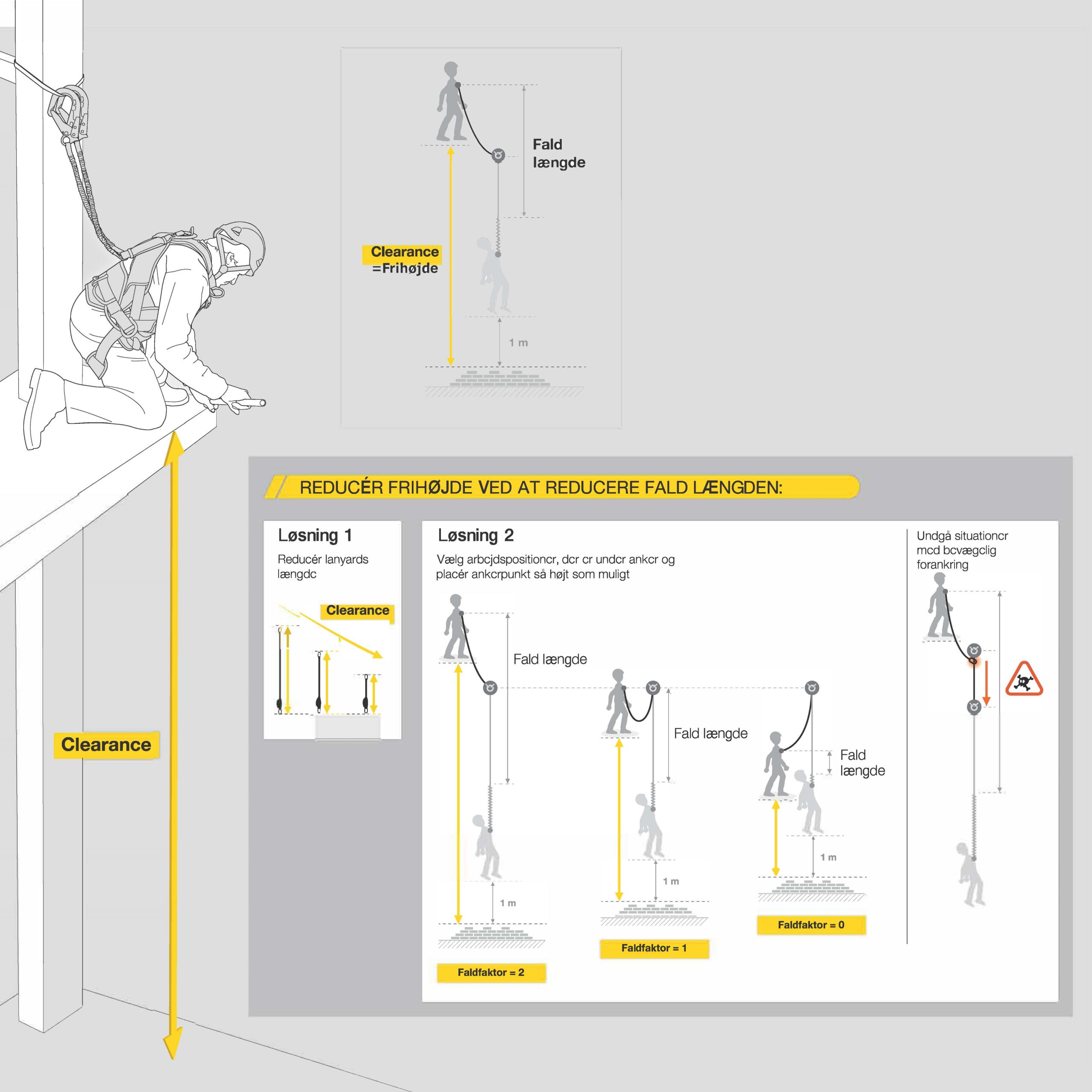 The fall factor must always be kept as small as possible, i.e. the length of any fall must be minimized, e.g. by choosing an anchor point above the user and the lanyard length should be kept as short as possible.